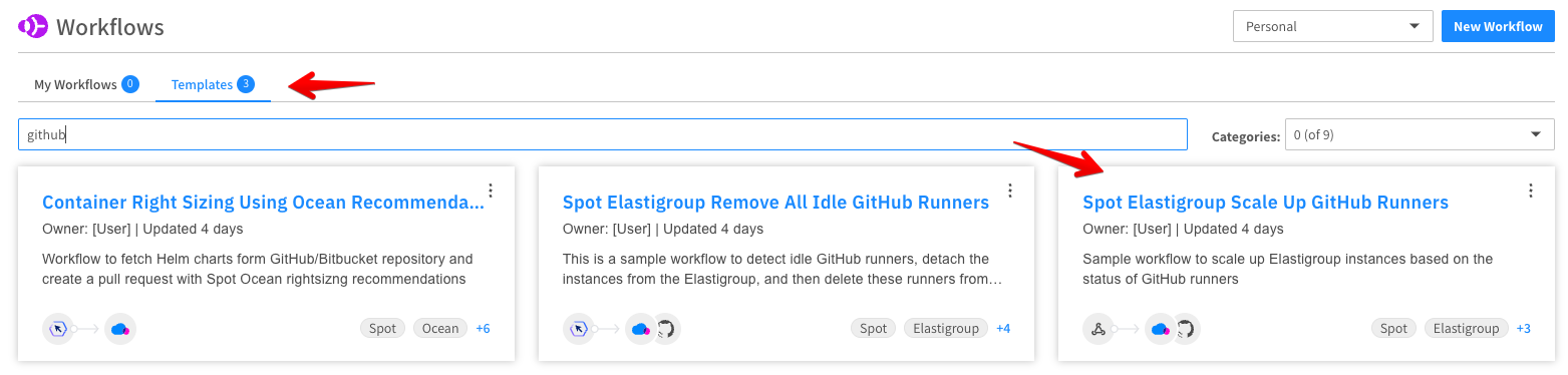 Under the Templates tab, select the Spot Elastigroup Scale Up GitHub Runners template.