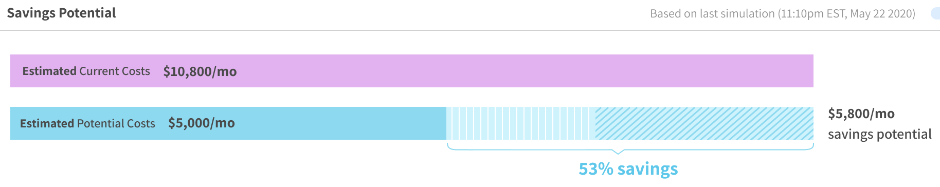 Insights calculates potential monthly savings as percents and dollar amounts. Hover your mouse over the bar to see the breakdown of savings achieved by using spot instances and applying the bin packing optimization.