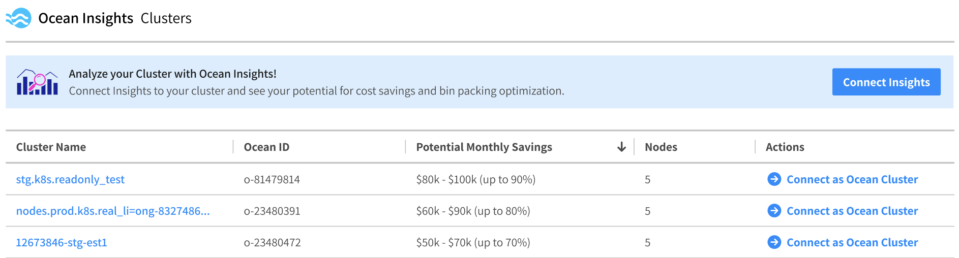 Once your Insights analysis is created, it is saved and added to a list of clusters on the Ocean Insights page. You can connect multiple Insights clusters and refer back to them on this page. These will remain and provide updated insights until the cluster is connected to Ocean.